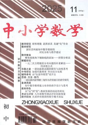 《中小学数学》创刊于1982年,由教育部主管、中国教育学会主办。分设小学(上旬)版、初中(中旬)版和高中(下旬)版,各版每月出版一期。